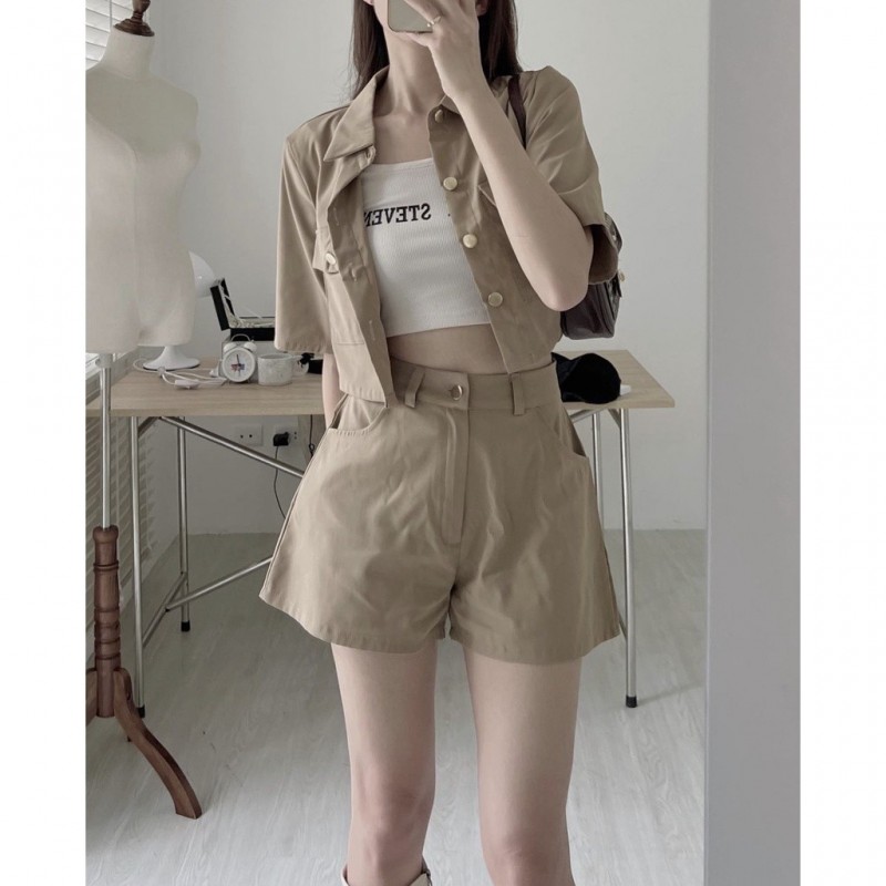 3-Piece Khaki Set: 3-Hole T-Shirt + Jacket + High-Waist Shorts Korean Style