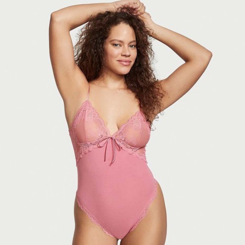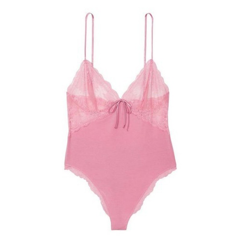 Victoria’s Secret Very Sexy Modal & Lace Plunge Bodysuit with Bottom Button 132060QE7, Pink Color, Size XS