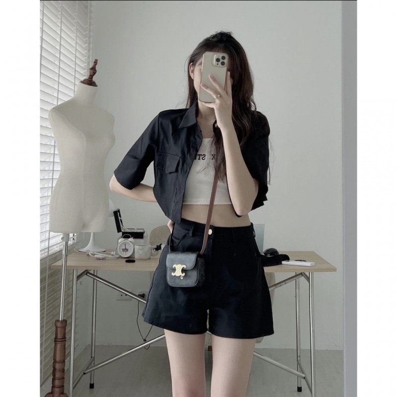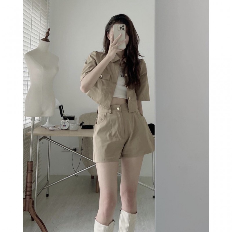 3-Piece Khaki Set: 3-Hole T-Shirt + Jacket + High-Waist Shorts Korean Style