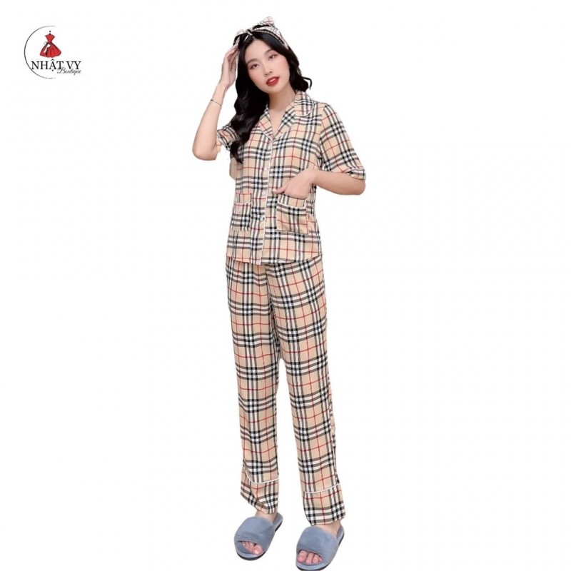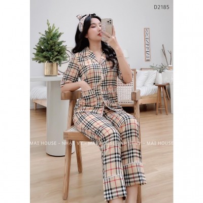 Checkered Short-Sleeve Long Pants Set with White Trim